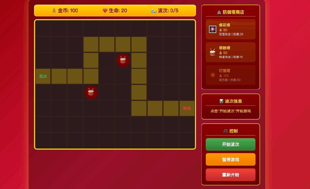 提示词:设计一个春节保卫战塔防游戏。要有完整的游戏机制,自行设计 地图系统、防御塔系统、敌人系统、波次系统、经济系统、生命值系统。视觉设计用春节喜庆风格。