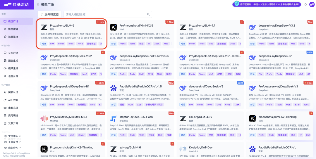 GLM-5 是登陆硅基流动 AI 云的第 154 个模型,支持命中缓存功能以及 198K 上下文长度。你可在 OpenClaw、Claude Code、Kimi Code、TRAE、Kilo Code、Cline 和 Roo Code 等工具接入 API 使用。