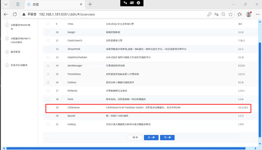 安装完HIVE之后,就剩下spark,flink,clickhouse。安装spark,flink比较简单顺利。准备安装OLAP 数据库clickhouse,发现datasophon 1.2.1 组件没有,没办法只能添加一个。