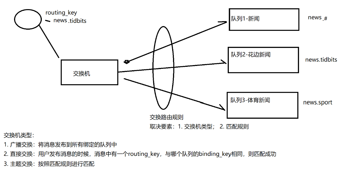 客户端将消息发布到指定的交换机,交换机这时候要考虑这条数据该放入到哪些与自己绑定的队列中,而这个考量是通过交换机类型以及匹配规则来决定的: