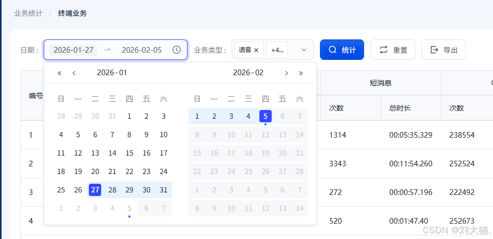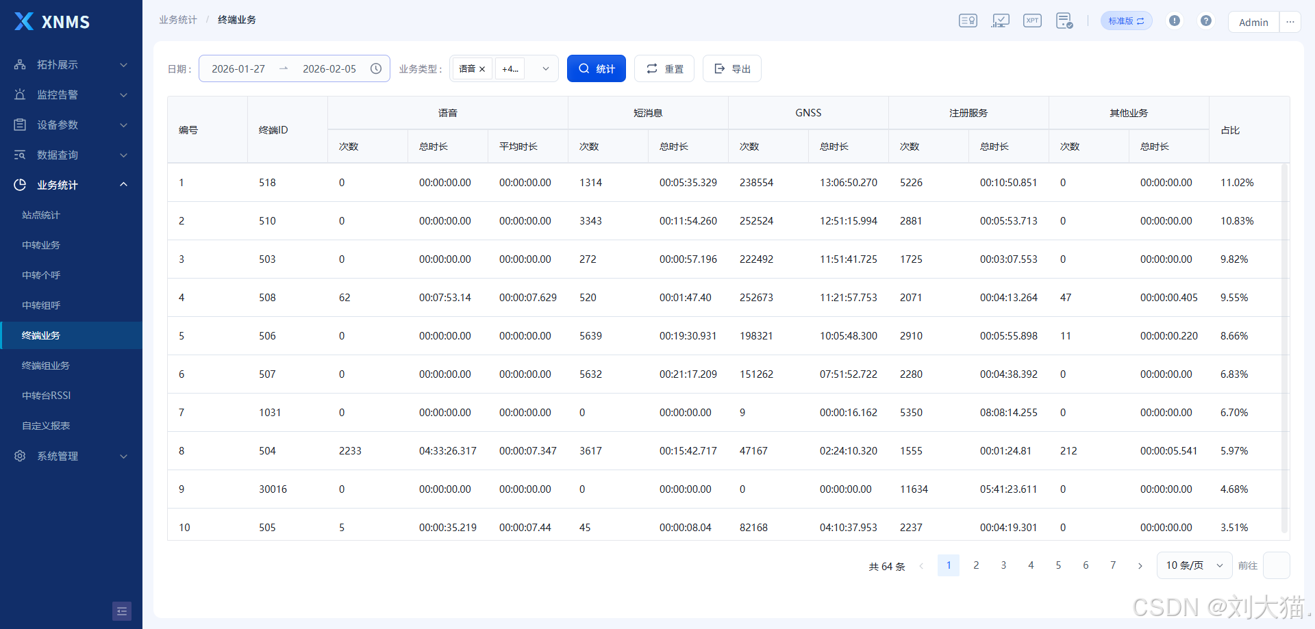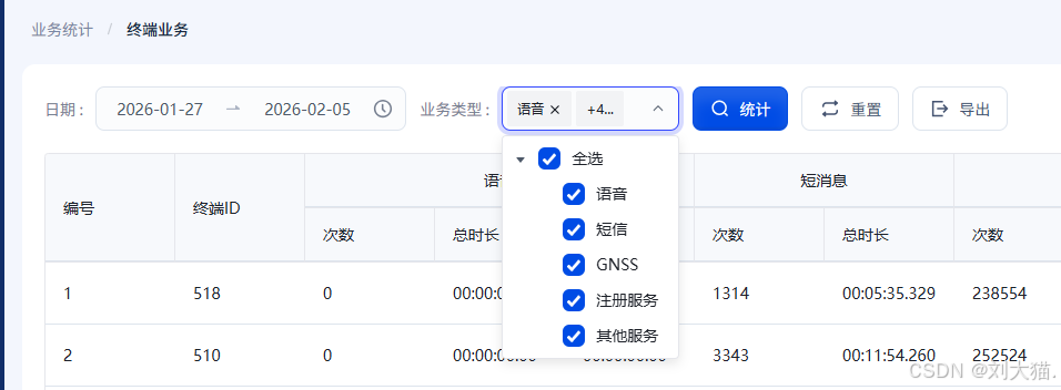 统计和导出指定时间段内,所有终端的业务信息,包括次数、总时长及其占比。终端业务类型包括语音业务、GNSS业务、短消息业务、注册服务业务和其他业务。