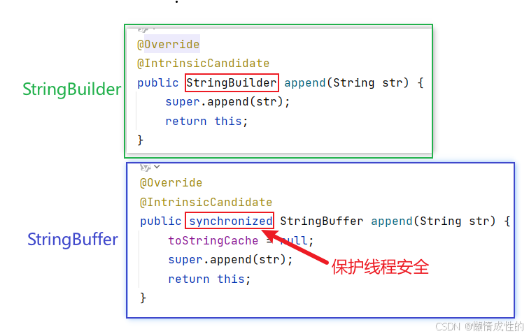 StringBuilder线程不安全(方法没有被sychronized修饰),性能较高(没有同步开销),适合单线程环境字符串操作