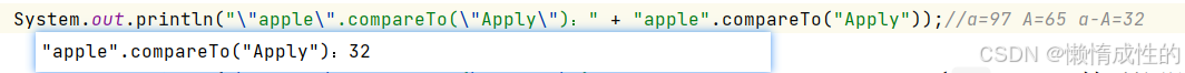 System.out.println("\"apple\".compareTo(\"Apply\"):" + "apple".compareTo("Apply"));//a=97 A=65 a-A=32