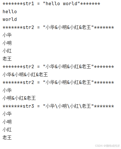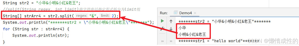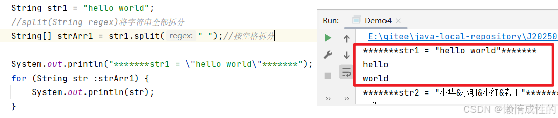 | split(String regex) | 按正则表达式分割字符串,返回字符串数组 |