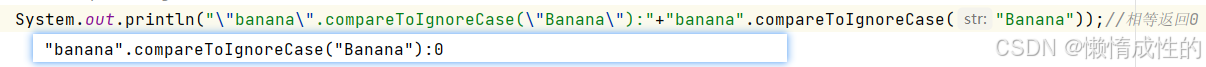 System.out.println("\"banana\".compareToIgnoreCase(\"Banana\"):"+"banana".compareToIgnoreCase("Banana"));//相等返回0