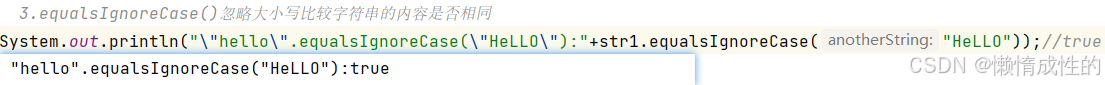 System.out.println("\"hello\".equalsIgnoreCase(\"HeLLO\"):"+str1.equalsIgnoreCase("HeLLO"));//true