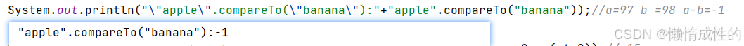 System.out.println("\"apple\".compareTo(\"banana\"):"+"apple".compareTo("banana"));//a=97 b =98 a-b=-1