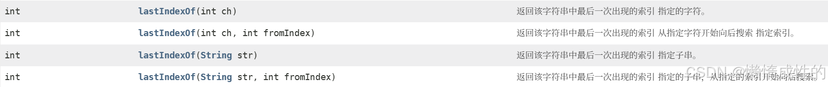 // int lastIndexOf(String str)返回str在字符串中最后一次出现的位置,从后往前查找,int lastIndexOf(int ch)与之类似