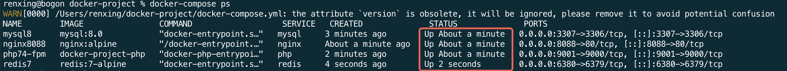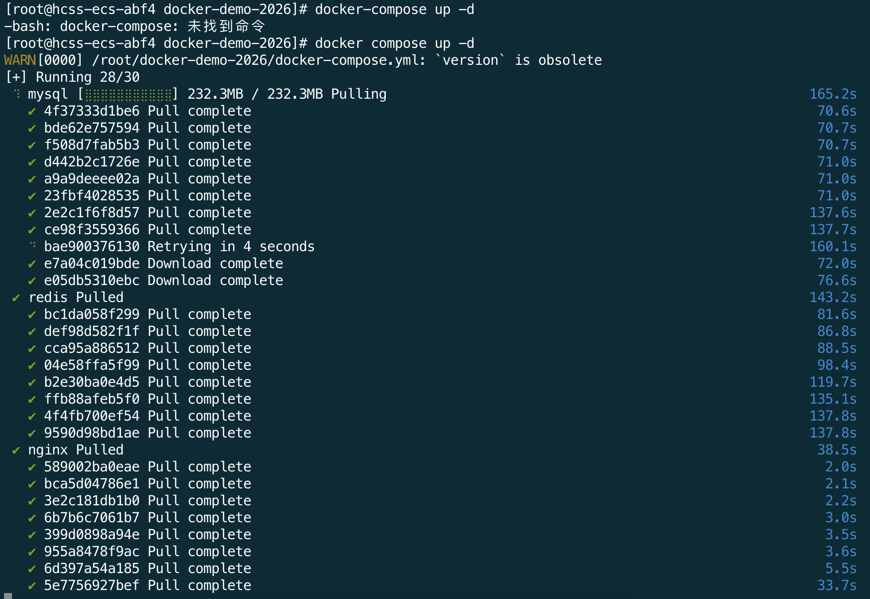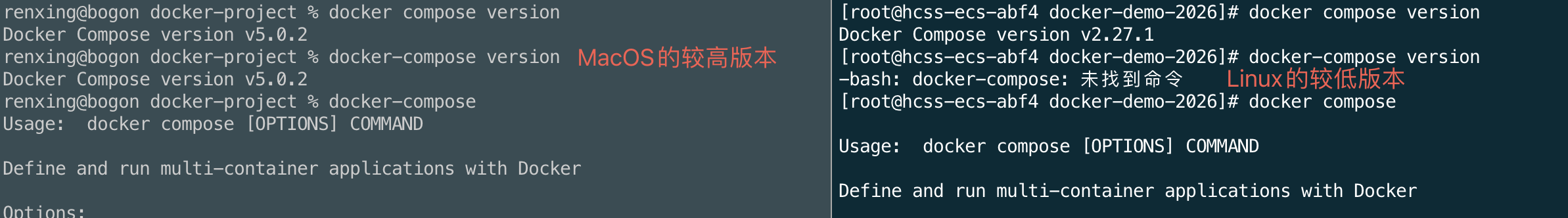 备注:在某些版本的docker中,docker-compose 命令可能不存在,需要使用 docker compose命令,也可以通过alias自定义映射命令。
