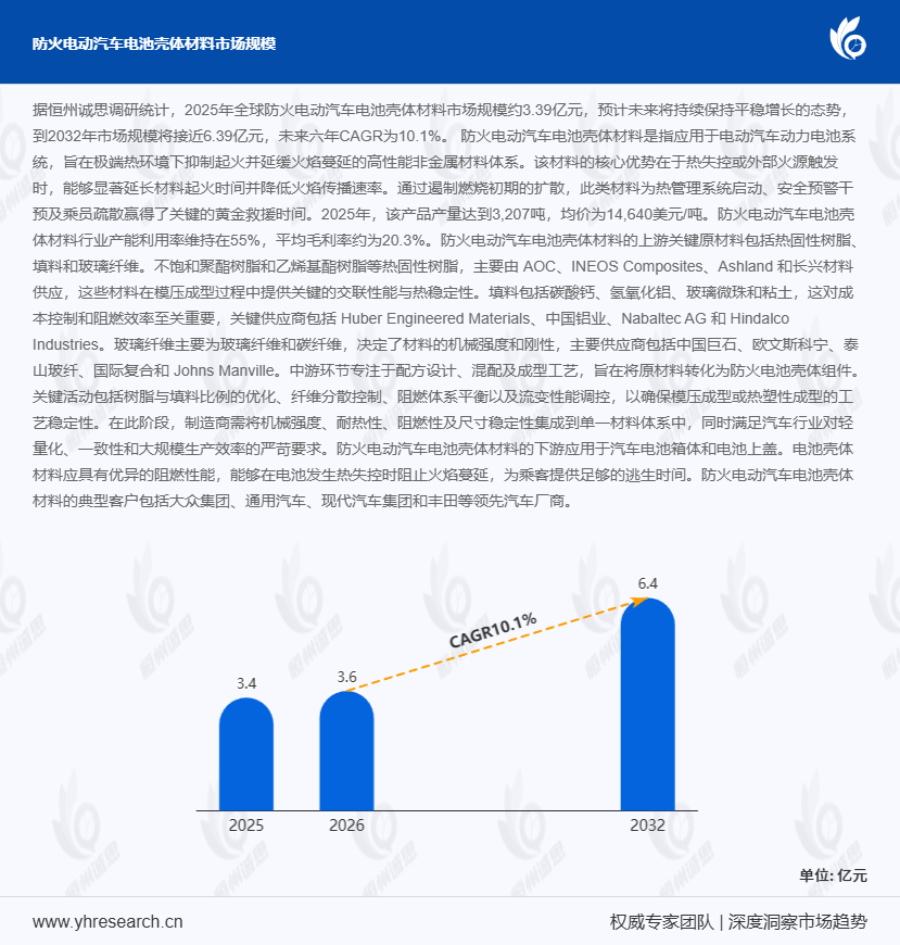 在新能源汽车产业迈向高安全化、轻量化发展的关键阶段,防火电池壳体材料作为动力电池系统的最后一道安全屏障,其技术迭代与市场扩张正成为行业焦点。据恒州诚思2024年Q2发布的《全球防火电动汽车电池壳体材料市场研究报告》显示,2025年全球市场规模达3.39亿元,预计至2032年将增至6.39亿元,期间CAGR为10.1%。这一增长受全球电动汽车产量攀升 、电池安全标准趋严 及主机厂安全冗余需求升级 三重因素驱动,防火材料通过延长热失控响应时间(较传统材料提升3-5分钟),为乘员疏散与热管理系统启动赢得关键窗口期。