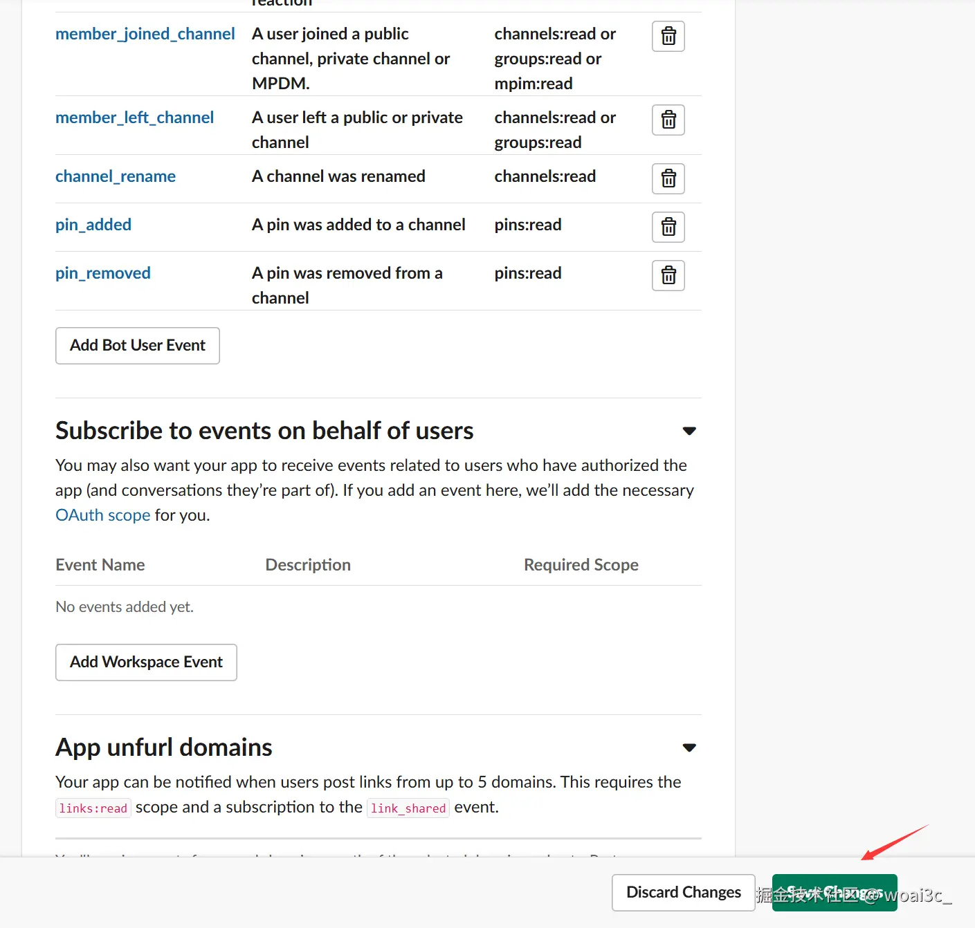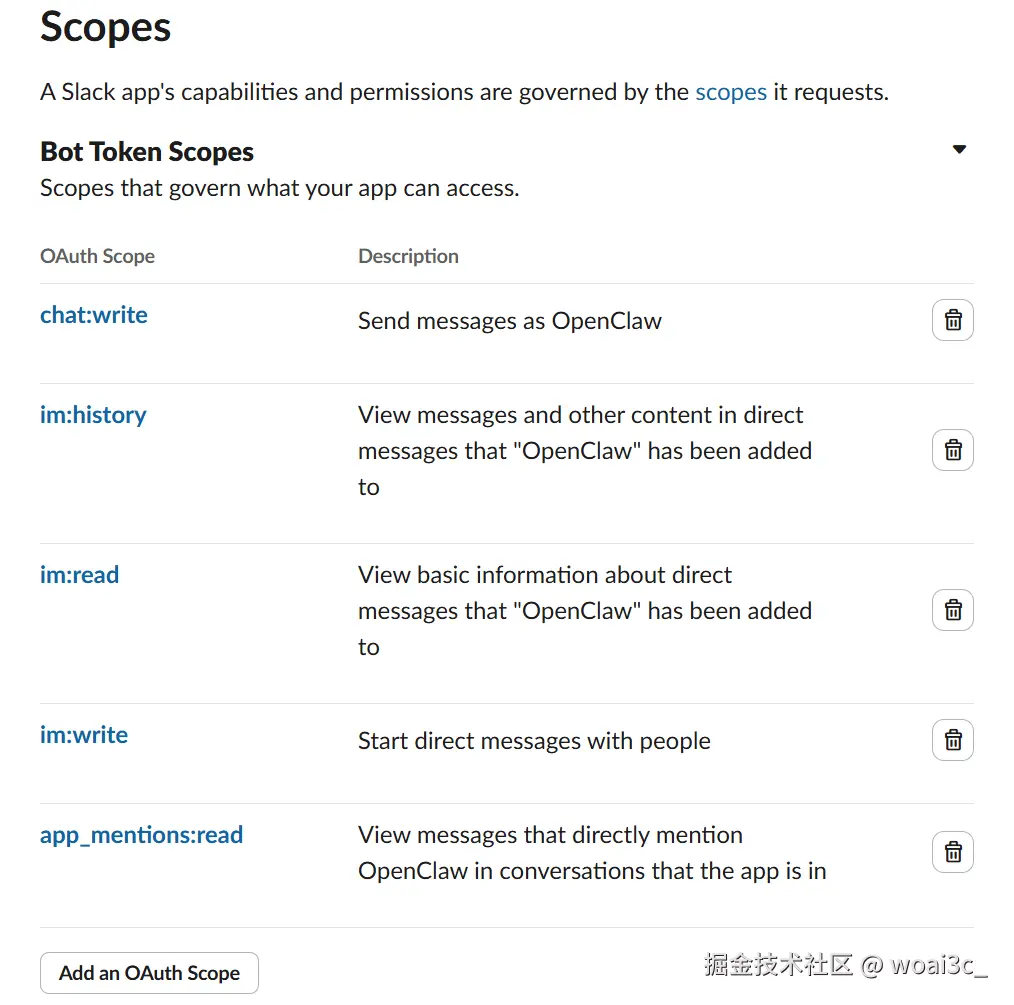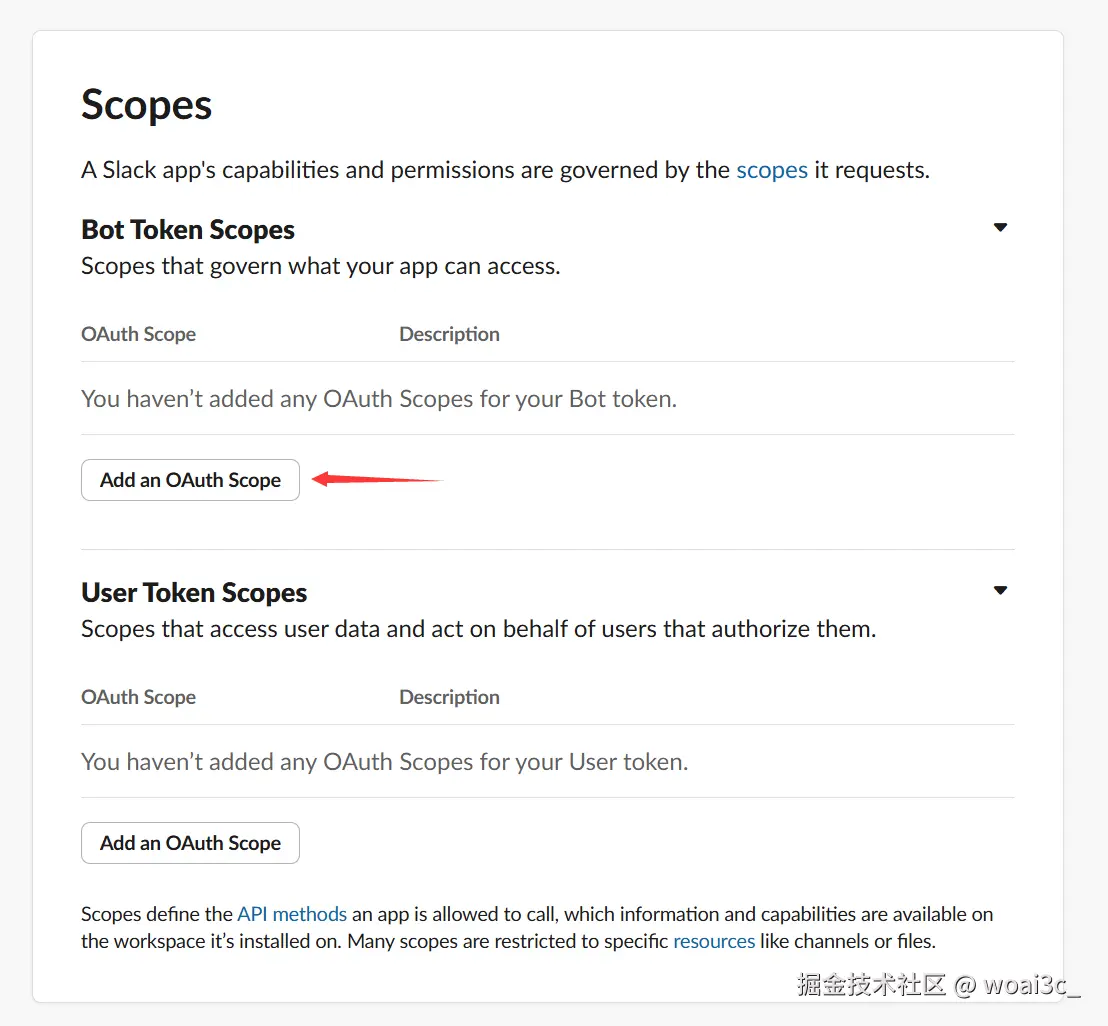 - 滚动到 Bot Token Scopes ,点击 Add an OAuth Scope,添加以下权限: