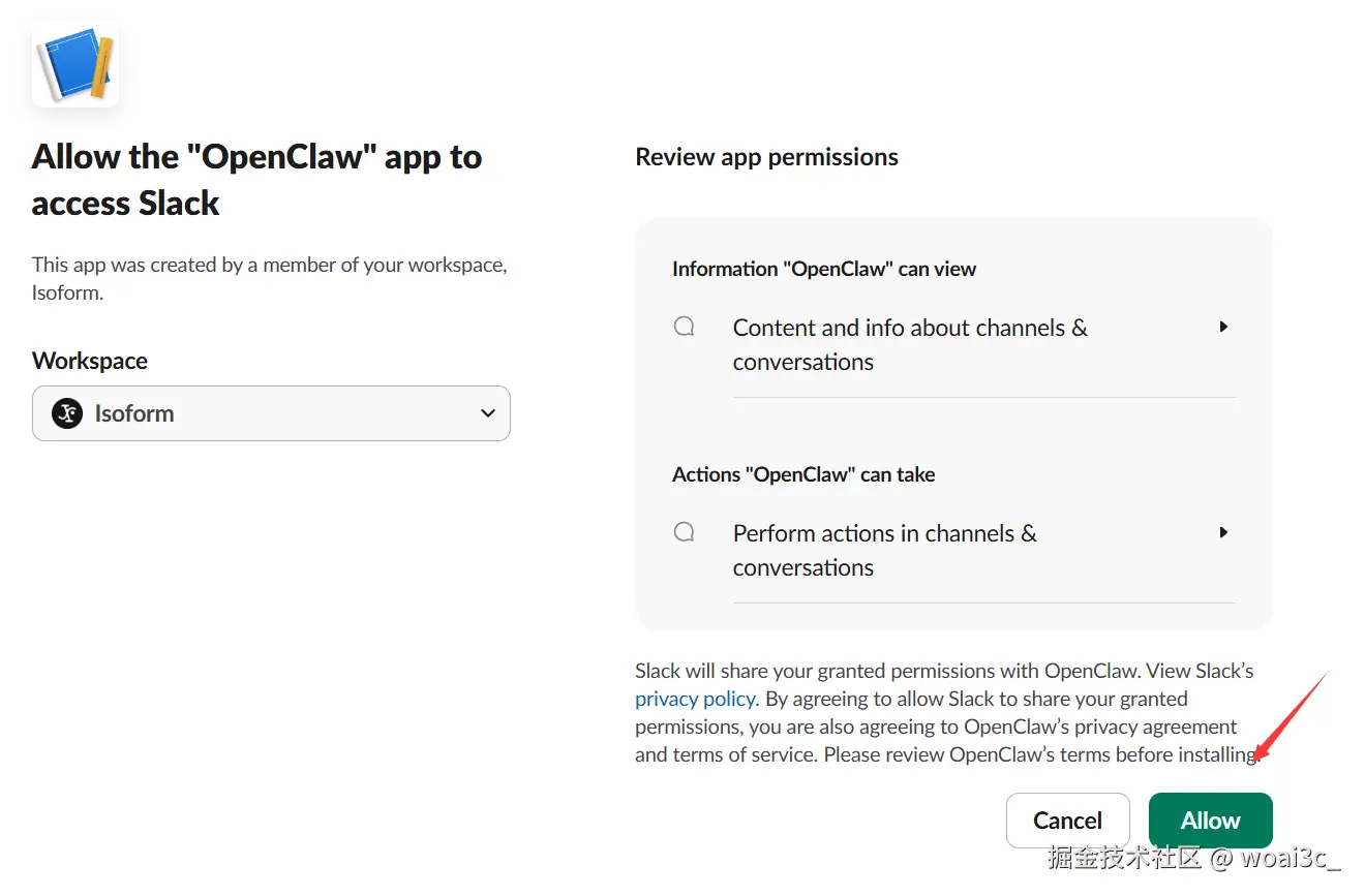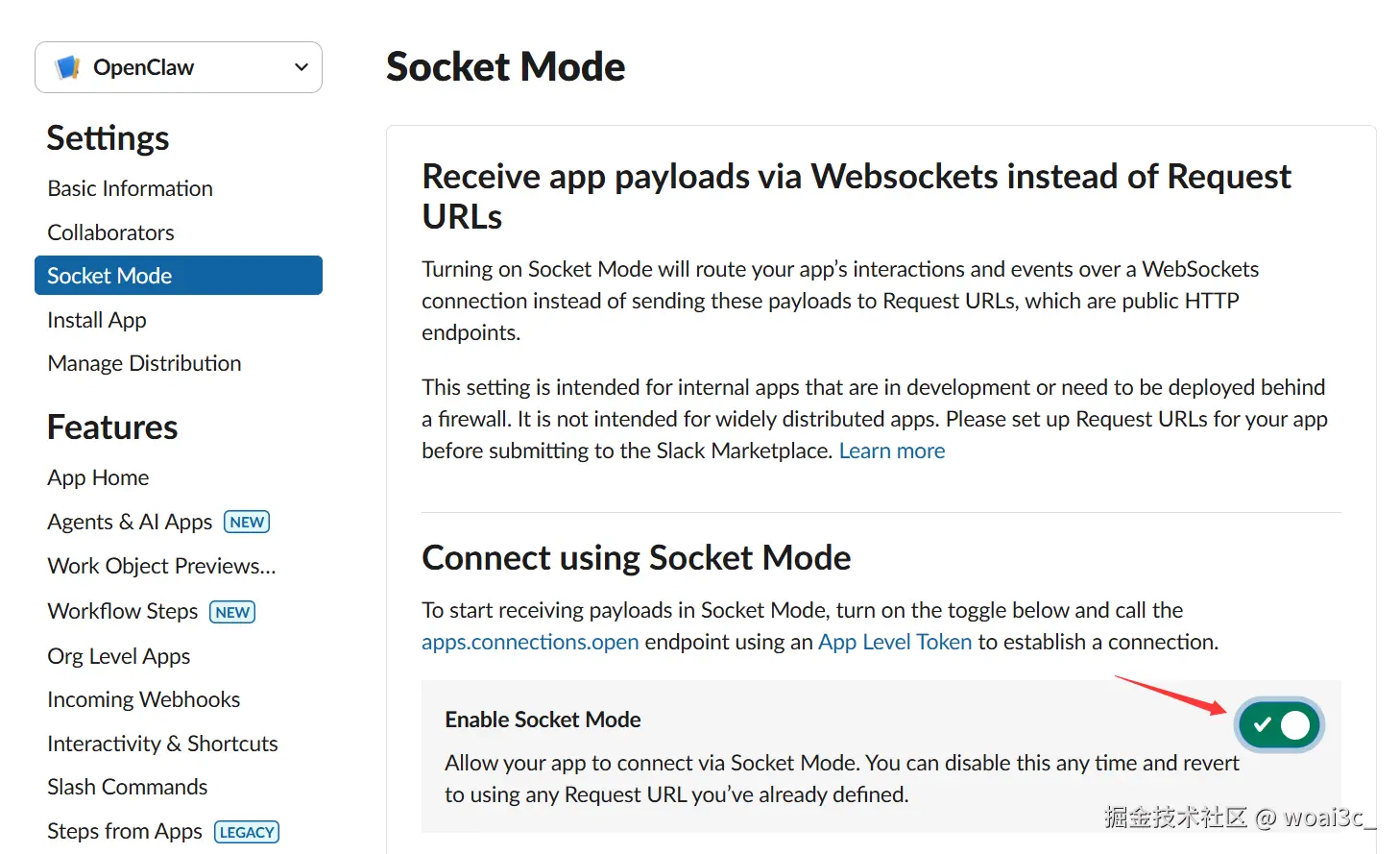 💡 OpenClaw 支持多种聊天渠道(Telegram、WhatsApp、Discord、Signal 等),这里以 Slack 为例。