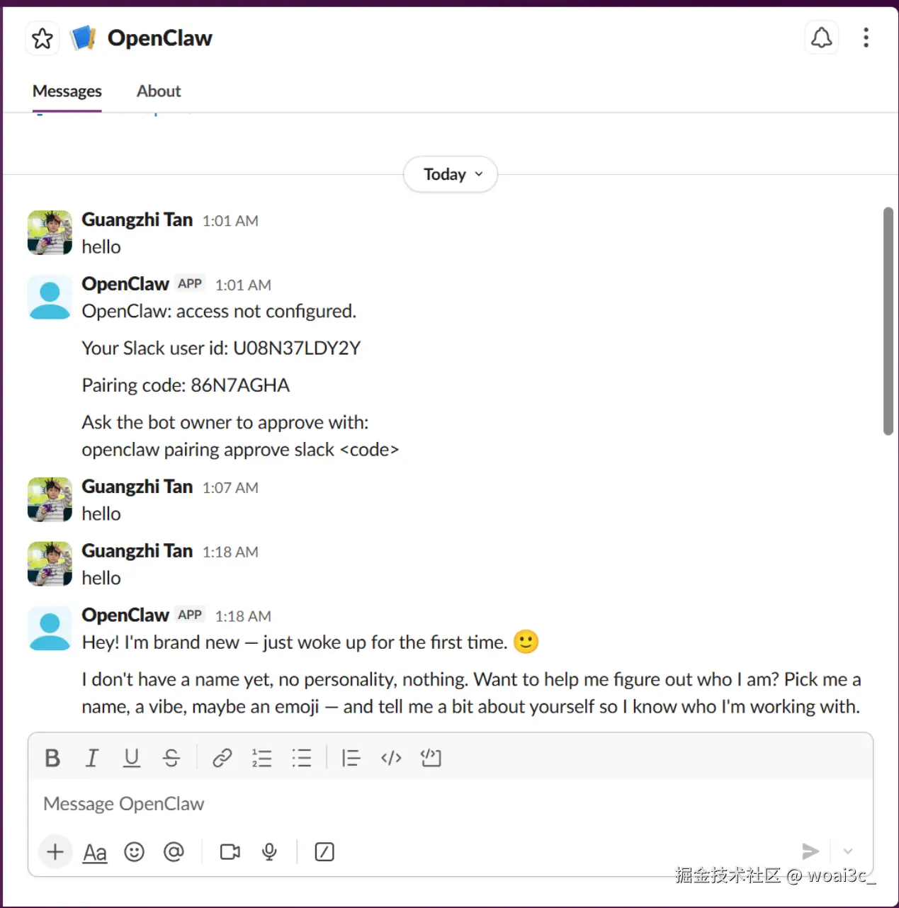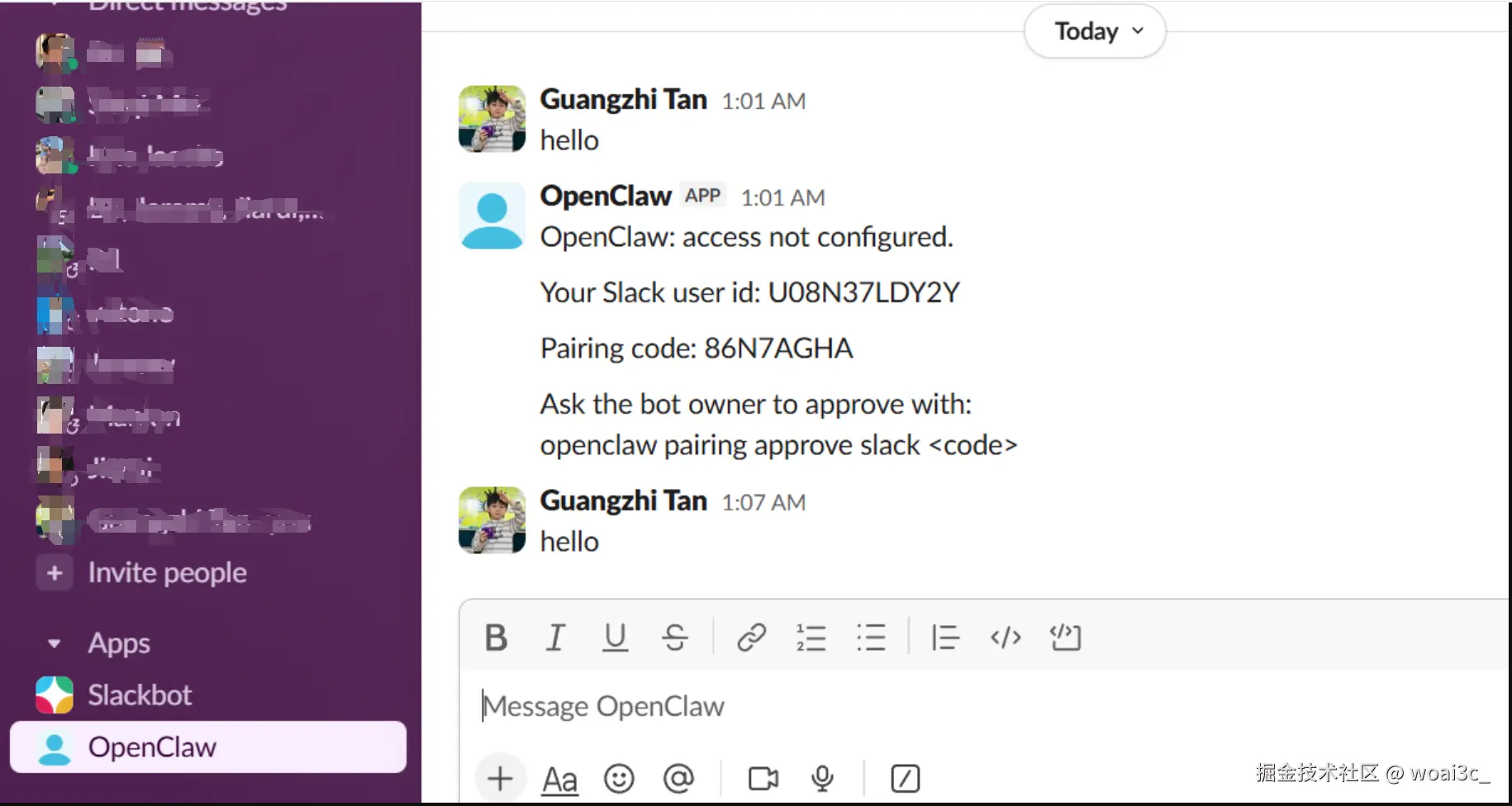 配置好 Slack 后,你可以在电脑或手机 Slack App 中随时发消息给 OpenClaw: