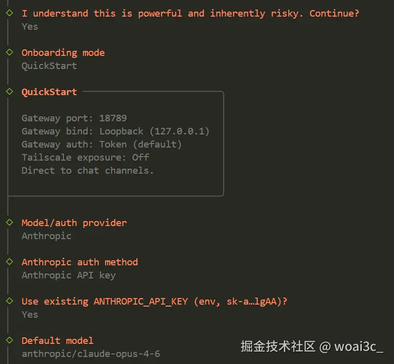 选择 QuickStart(推荐),会自动配置网关端口(18789)、绑定地址(127.0.0.1)等默认设置。