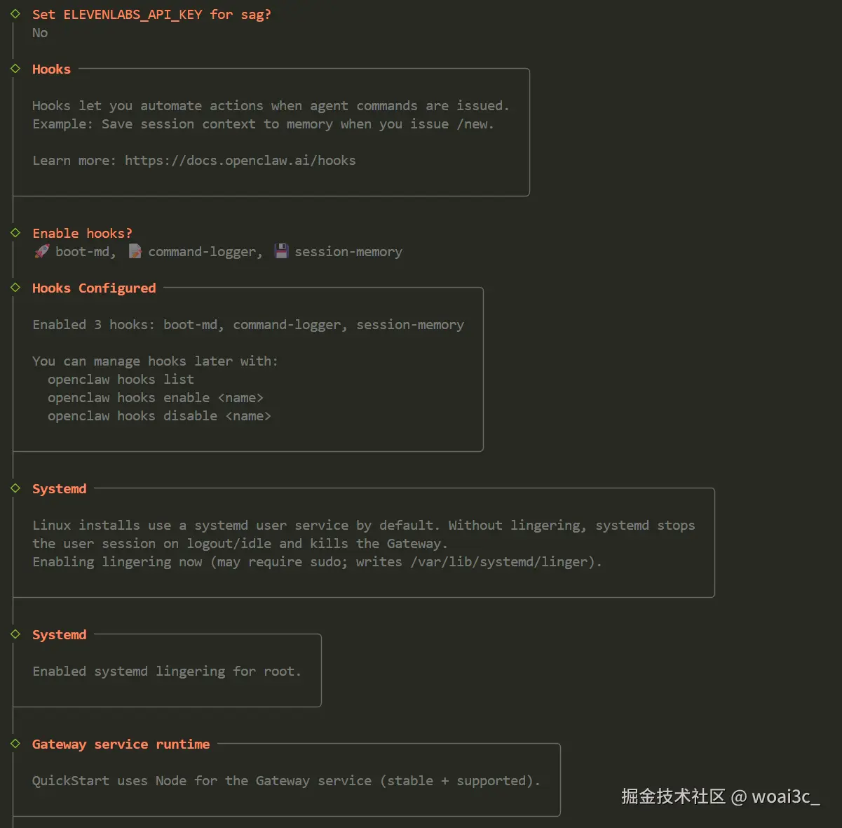 向导会交互式引导你完成所有配置,包括:AI 模型、聊天渠道、技能、Hooks、Gateway 服务安装等。