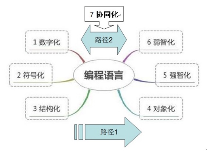 由图2可见,编程语言及其发展进化的七个特征:1.数字化,2.符号化,3.结构化,4.对象化,5.强智化,6.弱智化,7.协同化。反过来,分别用表示这七个特征的术语作为限定词与编程语言这个主词或中心词结合在一起,可分别表示编程语言及其发展进化的七个阶段,即:1.数字化编程语言(机器语言),2.符号化编程语言(汇编语言),3.结构化编程语言(三类控制语句可模块化的高级语言),4.对象化编程语言(图形直观化高级语言),5.强智化编程语言(基于知识的人工智能化高级语言),6.弱智化编程语言(基于广义双语的"傻瓜化"高级语言),7.协同化编程语言(三类双语即六种语言可协同运行的三多知识库建构的选择式语言)。