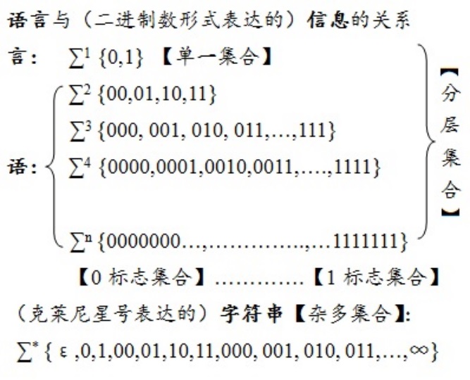换句话说,明确"言"在形式上可作为"语"在形式上的计量单位即其所含具体"言"之重用频率及组合与分解的各种分布情形的测量或计量"尺度"。因"言和语的序位关系"在理论上唯一守恒,"序位关系,唯一守恒"法则(即本真信息定律)在图5所述"言和语"范畴之内是可证成的。因此 应用图5所述以二进制数为例的"言和语"之间"序位关系,唯一守恒"法则(即本真信息定律)用"单一集合"作"基准参照系"来计量"分层集合"的每一层"子集"及其成员,可进一步测量或计量各种"标志集合"。虽然,被选"标志"可造成相互冲突,但是,不影响"分层集合"完整序位体系的自洽性。