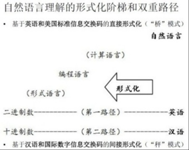 可这样来理解图3中那个由右向左的"形式化"箭头所表达的是自然语言理解的形式化方向,有两个基本路径:一是二进制的算术语言、形式语言、(高级)编程语言、计算语言和以英语为例的自然语言共五个等级,均归属于第一路径,前五代编程语言划归在其中,二是十进制的算术语言和与其按照函数关系同义并列的以汉字汉语为例的自然语言,归属于第二路径,第六和七代的编程语言则划归在这里(提示:由于在此涉及双重路径,因此,涵盖三类双语),可经十进制转换为二进制来间接形式化以及间接计算自然语言,故称为第二方略,它是明显区别于第一路径的各个阶梯的一系列直接通向二进制的"桥梁",就是说,第二路径的机人或人机对话广义双语"天平",也可以根据时间次序和空间位置的一系列分布情形来解决用户的针对性的问题。例如,这就像一个虚拟的"天平"其左边十进制数即标准化的"砝码"与其右边的汉字汉语,即待称量的非标"东西"(在此是汉字以及基于它而组合变换的汉语)。汉字具对象化特征,可满足间接计算"笔画和音节"这样的条件,也可满足以同样方式间接计算"字、式、图、表、音、像、立体、活体"对象的条件。如果把它们视为广义的语言和言语,那么,也就能采用"言和语"的划分及其可演绎推理的一系列"关系"来区分"单一的言"及"二元乃至多元的语"和其中蕴含的多个系列的"关系"。
