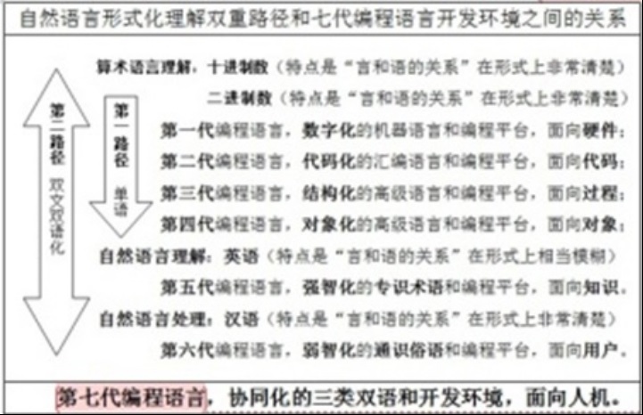 换一句话说,上述两大类形式化方略,在看待和取舍"智"的问题上,"强或弱"殊途同归于"智","强或弱"傻瓜编程语言,在半个多世纪的时间云集了各方面的人才,创建了编程语言发展的四个里程碑,其理论基础是非常坚实的,但是,在进入的第五个和第六个里程碑的交汇处即"智能化"发展阶段,却遭遇了"强智"与"弱智"的冲突,在理论上是"强人工智能"与"弱人工智能"之间冲突。如果说"结构化"为其相应的各个严格受限的专门领域的知识工程奠定了高级编程语言的基础,"对象化"为其相应的各个严格受限的专门领域的人机交互即简化了高级编程语言的形式,那么,进一步把"强智化"和"弱智化"结合,"强智"与"弱智"相辅相成,就必然为形式化双重路径铺平道路。于是,笔者就想,既然最终追求的是两类用户编程语言和设计软件的"傻瓜化"即"强智"与"弱智"相辅相成,为何不可在前人和他人走过的"第一路径"即"第一大类形式化方略"外另辟蹊径寻找前人和他人没有走过的"第二路径"也就是"第二大类形式化方略"呢?事实已经证明前人和他人走的"第一路径"即"第一大类形式化方略"在"神造"多种自然语言互通障碍外,又"人造"两千多种编程语言互通障碍,对非英文尤其是中文用户特别不利。