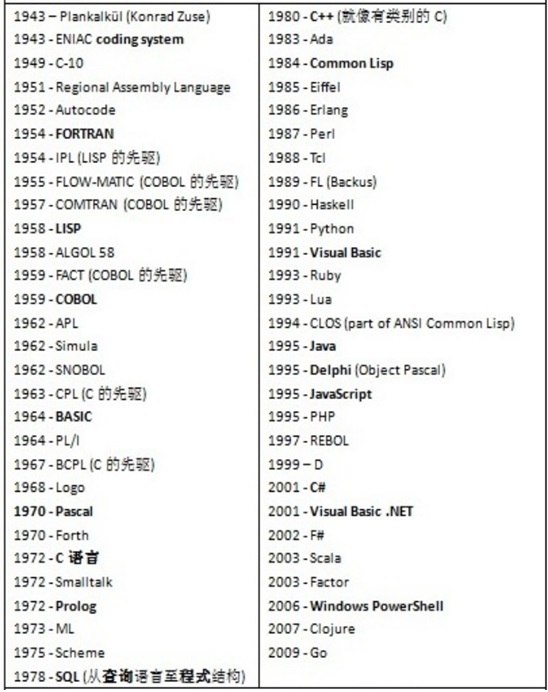 由图1可见,从1943年至2009年以来众多编程语言中选出的这几十种来看,就有不少是普通程序员们不知道的,除非他专门研究过编程语言的发展演变历史。这就好比是发生在编程语言领域的第二类"巴比塔",相对于古希腊寓言故事在自然语言领域的第一类"巴比塔"情形来说,其区别就在于第二类问题是人造而第一类问题是神造。