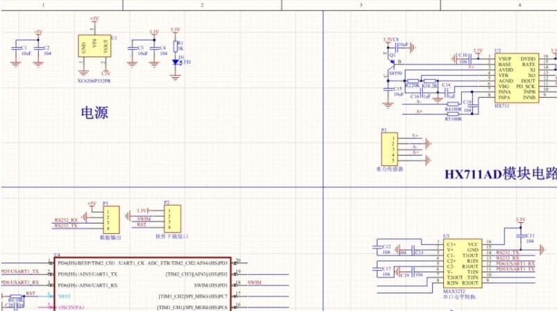 电子秤实物量产资料 原理图和PCB文件及BOM,源码HEX 量产HX711电子秤采集模块全套资料 1.串口波特率19200; 2.上电后直接串口打印称重数据; 3.可以发指令校零传感器,读取称重数值; 4.默认使用的是40Kg的传感器,其它传感器需要重新修正参数; 5.有看门狗功能,减少程序异常; 6.STM8F103驱动HX711 包含原理图和PCB及源码(详细注释代码)。