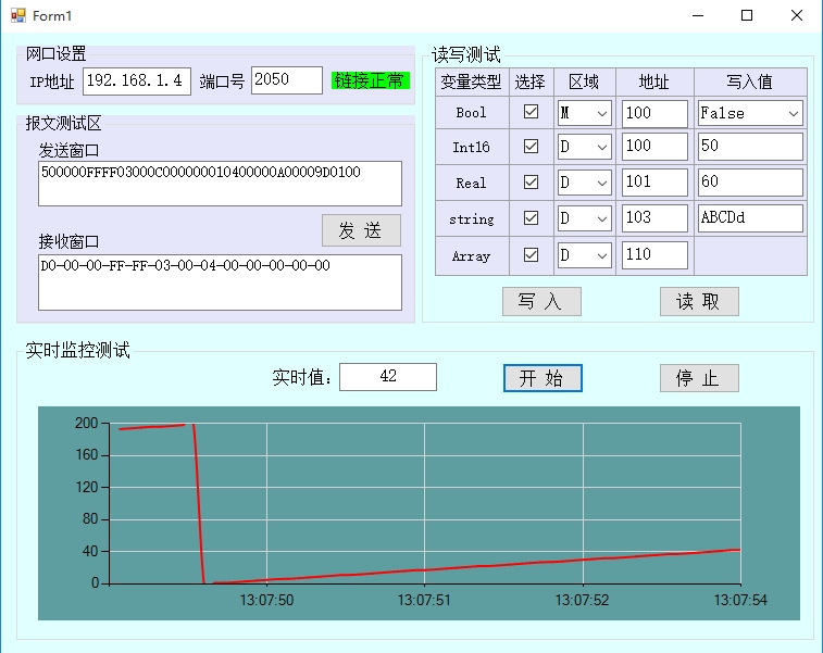 | 实时监控区 | 实时值文本框、开始/停止按钮、折线图 | 启动/停止实时数据采集,在折线图中展示历史数据(如D50的浮点数变化) |