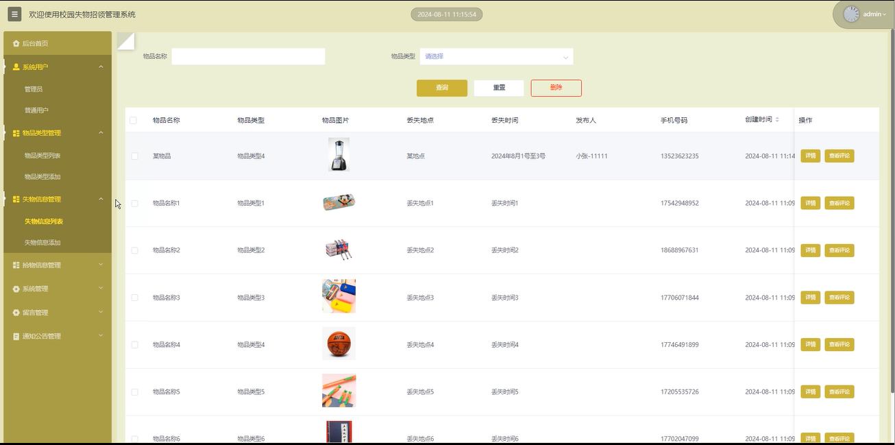 失物信息管理:管理员查看和管理用户报告的失物信息。列表中展示了失物的详细信息,如物品名称、类型、图片、丢失地点、丢失时间、发布人等,并提供了查看详情和评论的功能。管理员可以通过输入物品名称或选择类型进行查询,并对失物信息进行删除和重置操作。同时,管理员还可以添加新的失物信息,确保信息的及时更新。其界面如下图所示。