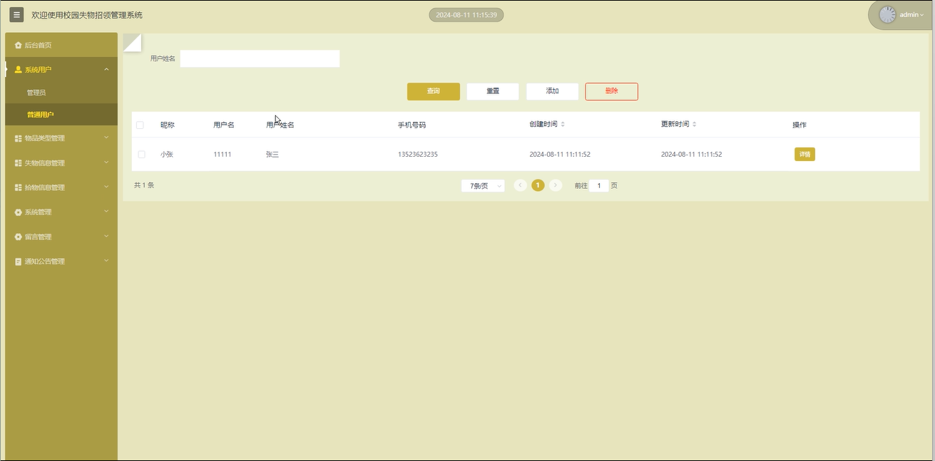 (3)用户权限管理功能:系统提供完善的用户权限管理功能,确保失物招领系统的安全性和数据的保密性。管理员可以对系统中的用户(包括普通用户和管理员)进行管理,按照不同角色分配相应的操作权限,防止越权操作。严格的权限控制机制确保系统操作的安全性和规范性。