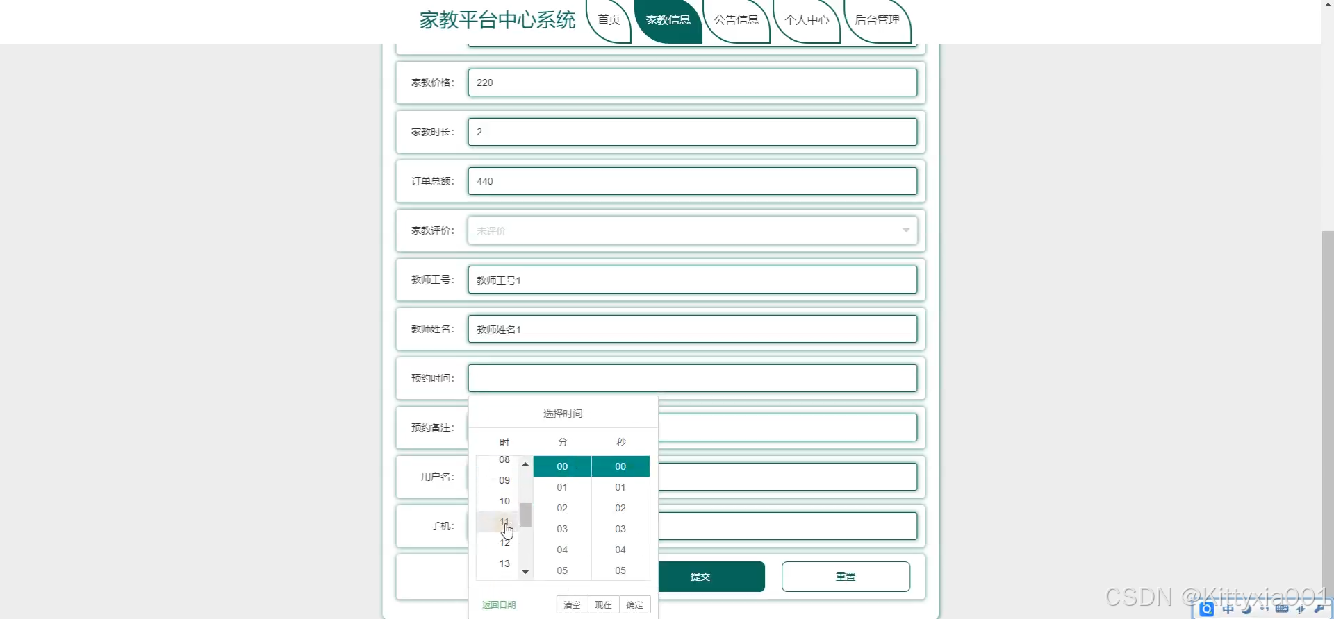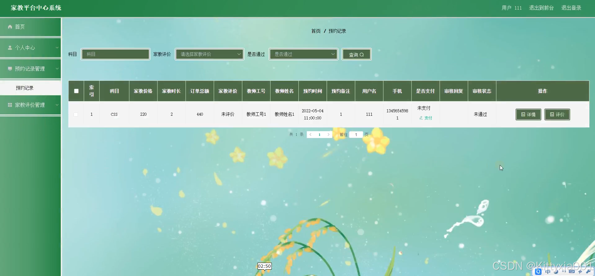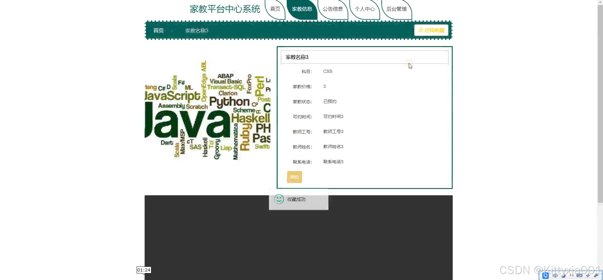 系统功能:家教,用户,科目,家教信息,预约记录,家教评价