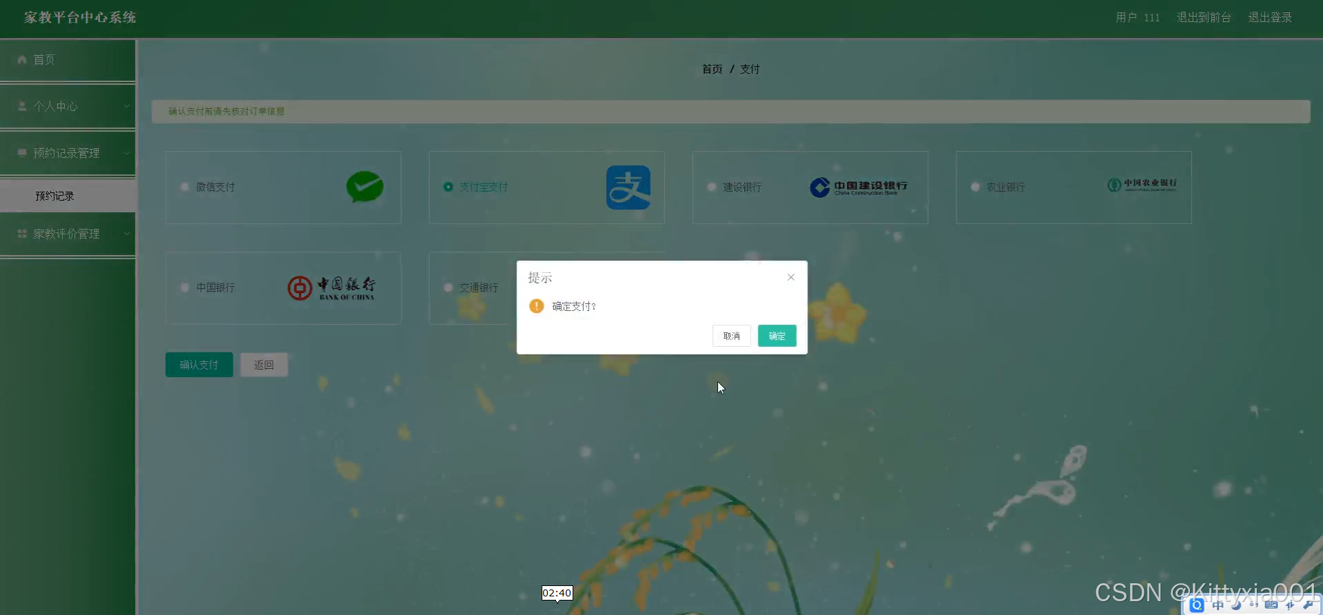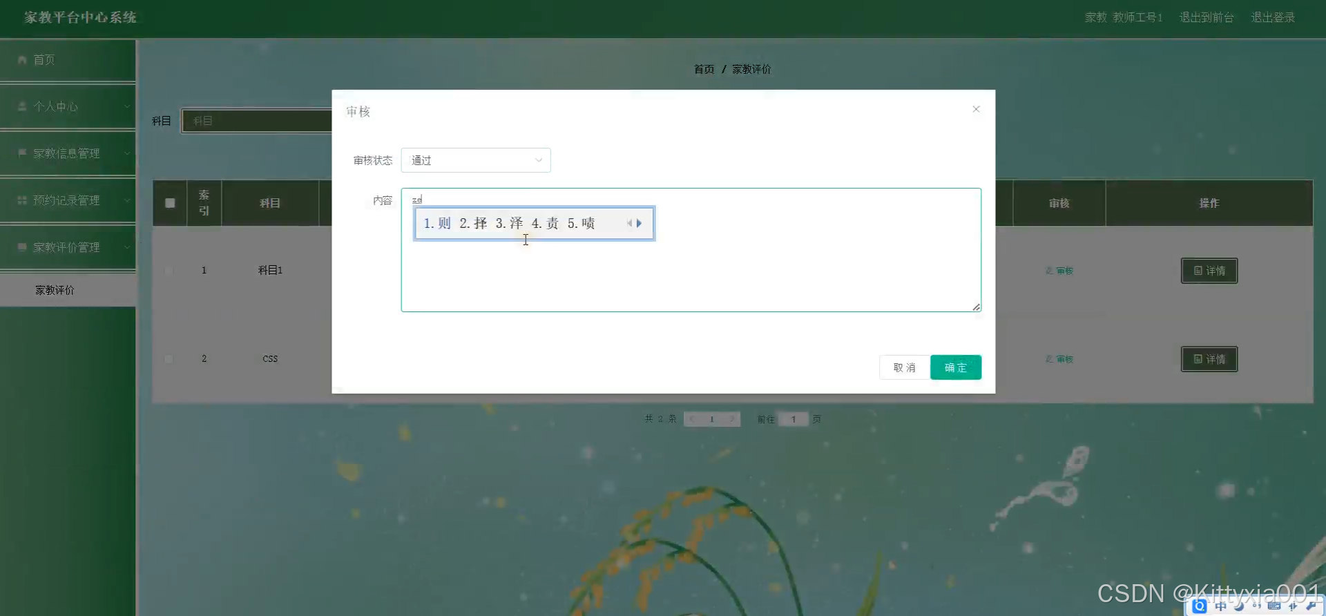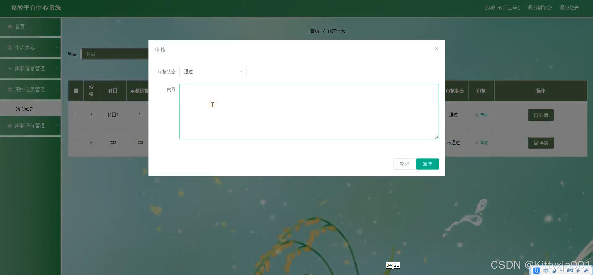 系统功能:家教,用户,科目,家教信息,预约记录,家教评价
