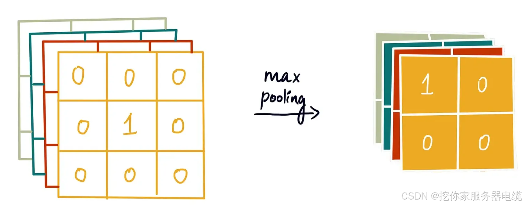 ● 池化层:压缩数据(e.g., 最大池化,取窗口 max),降维、防过拟合、加平移不变。