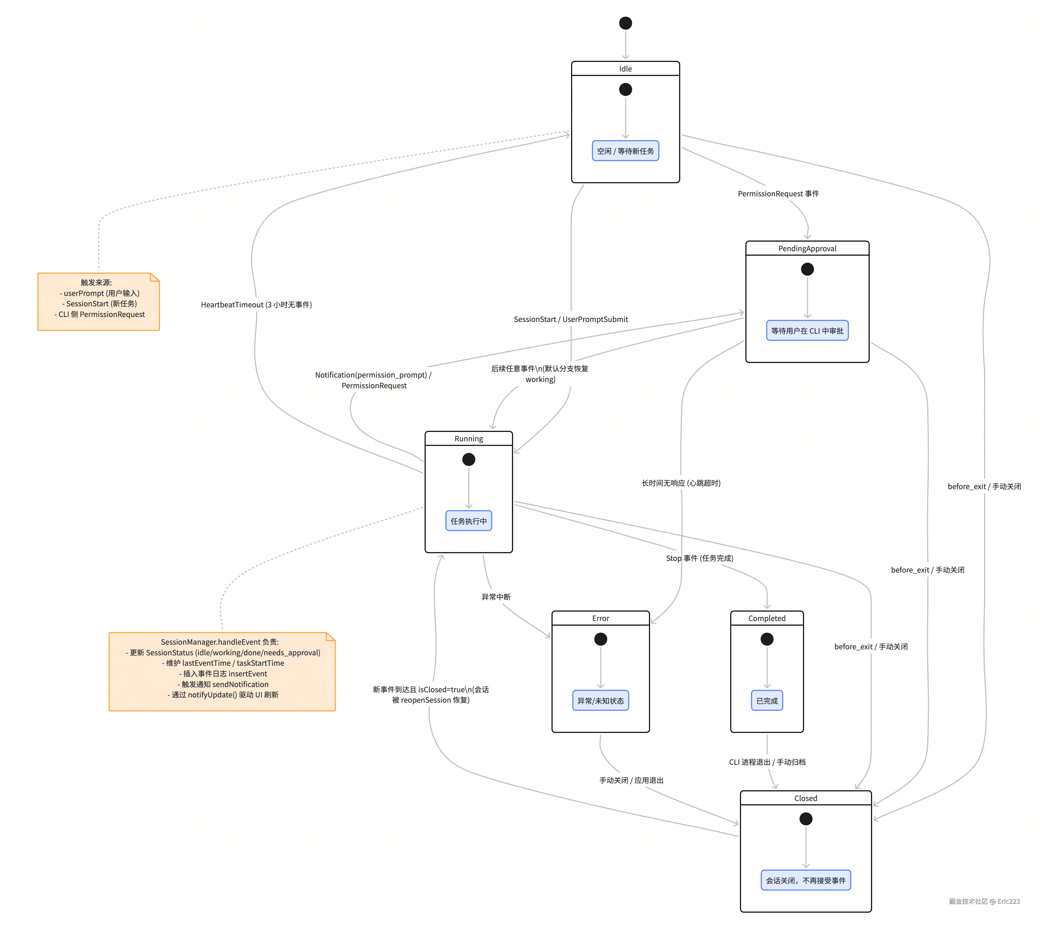 上图是会话生命周期的状态机图。它详细描述了 Idle、PendingApproval、Running、Completed、Closed、Error 等核心状态,以及触发它们之间转换的关键事件。