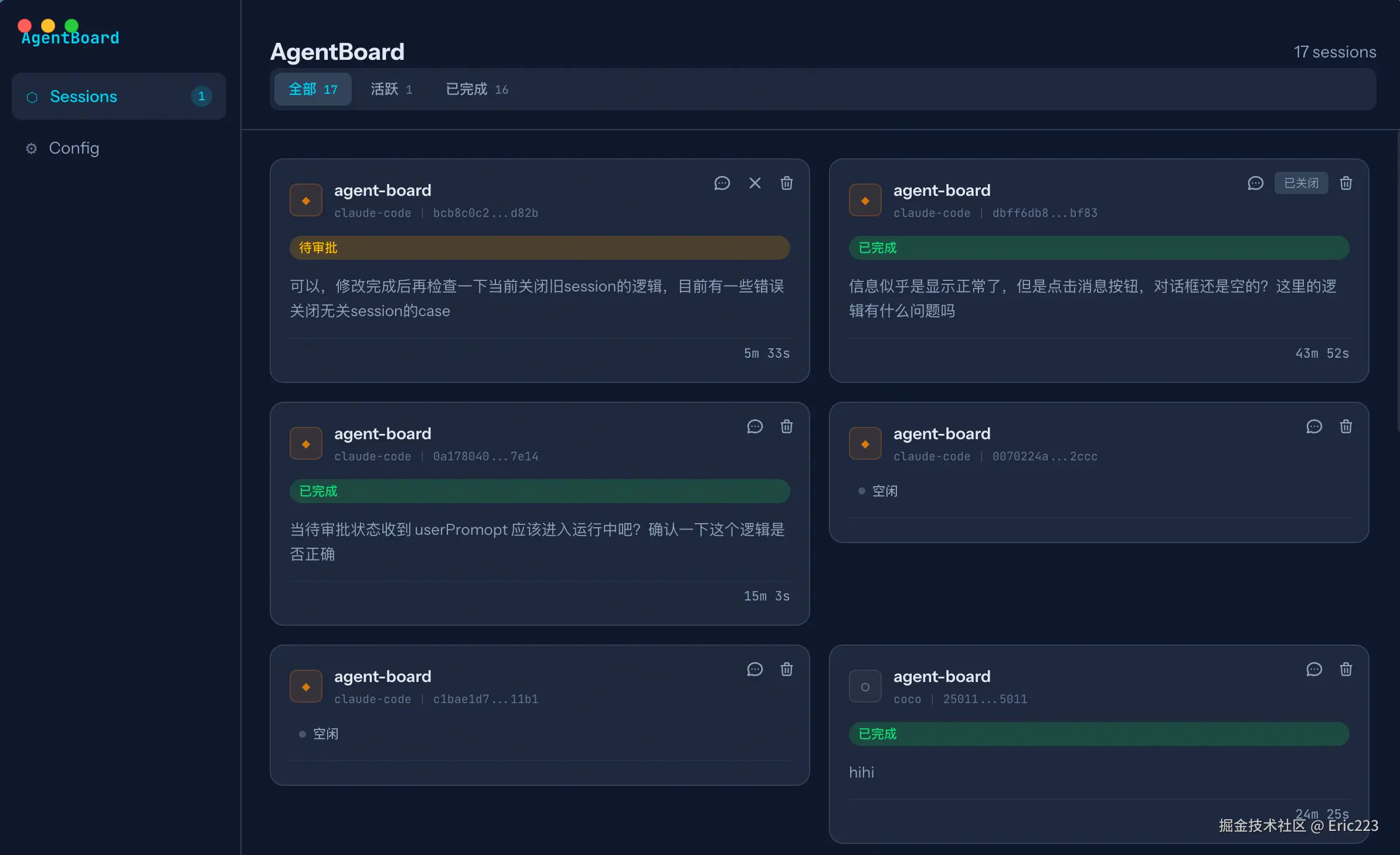 agent-board),由哪个 CLI (claude-code) 驱动,以及它的唯一Session ID。 - 状态:醒目的彩色标签(如"待审批"、"已完成"、"空闲")让你瞬间抓住重点。