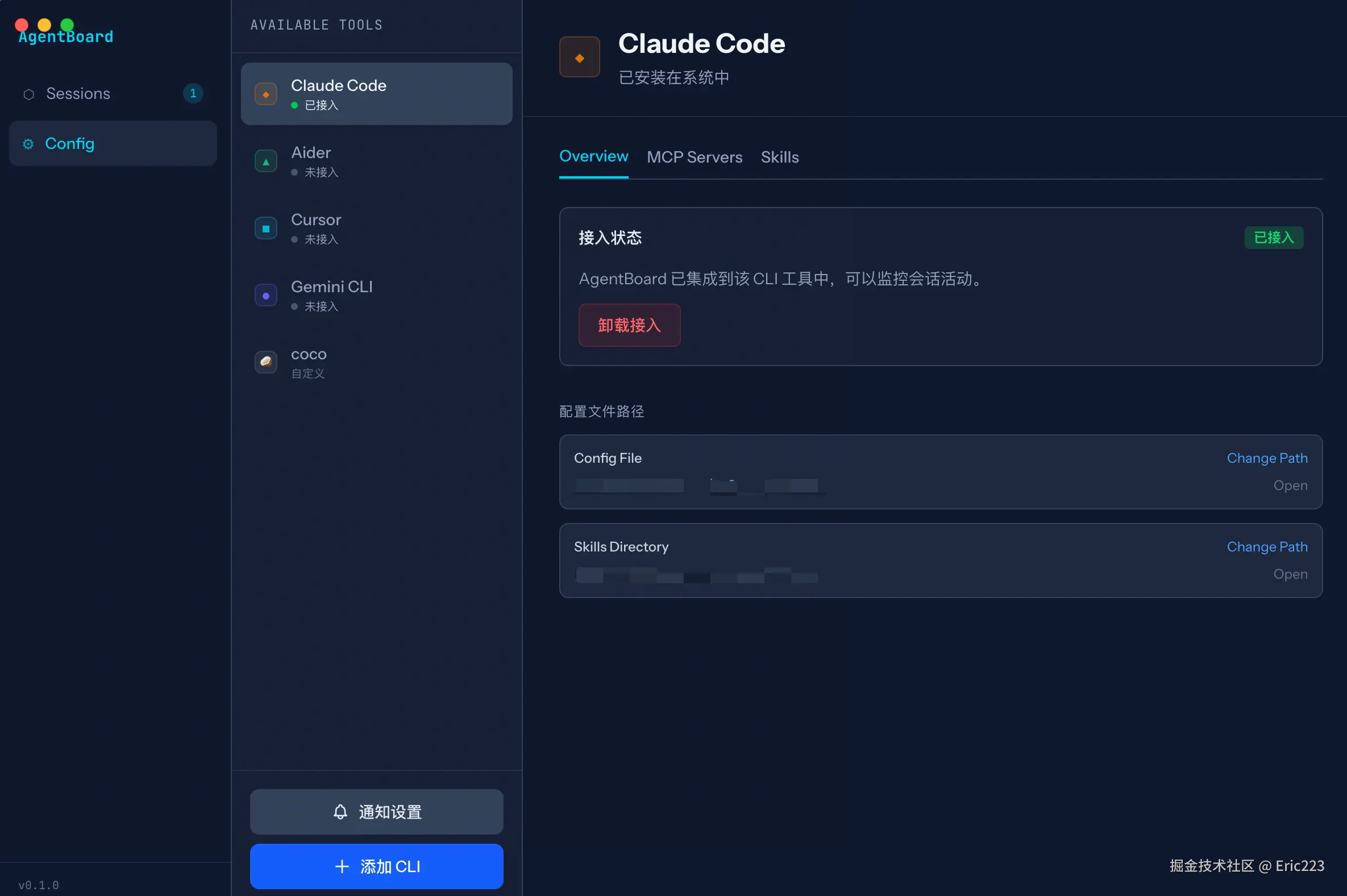 - 配置路径管理:你可以直接在这里看到甚至修改工具的配置文件和 Skills 目录路径,省去了在文件系统中翻找的麻烦。
