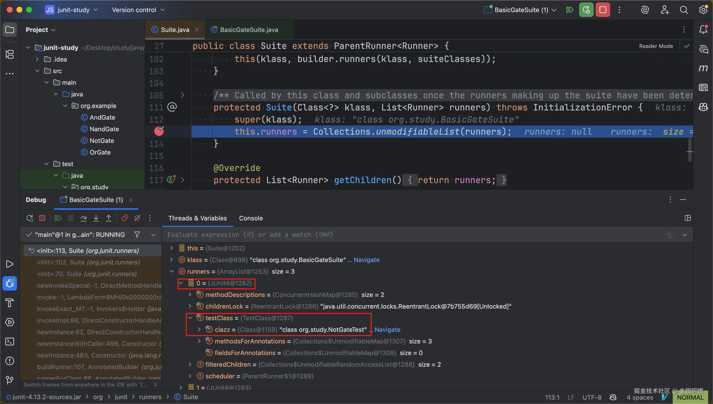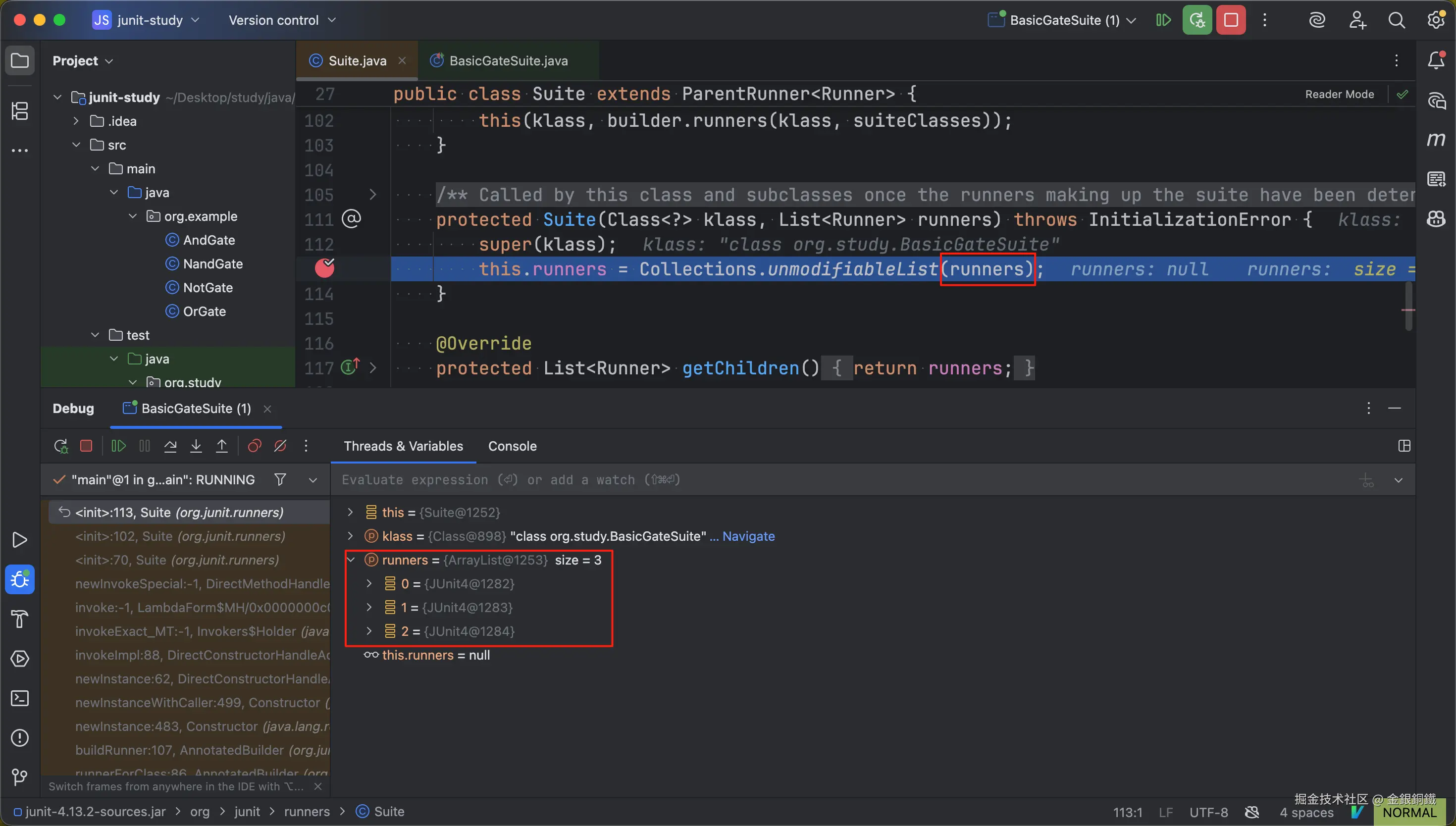 我们在第 5 个构造函数里打一个断点(比如可以在第 113 行打一个断点),然后 debug BasicGateSuite 里的 main 方法,可以看到 runners 参数里包含了 3 个元素
