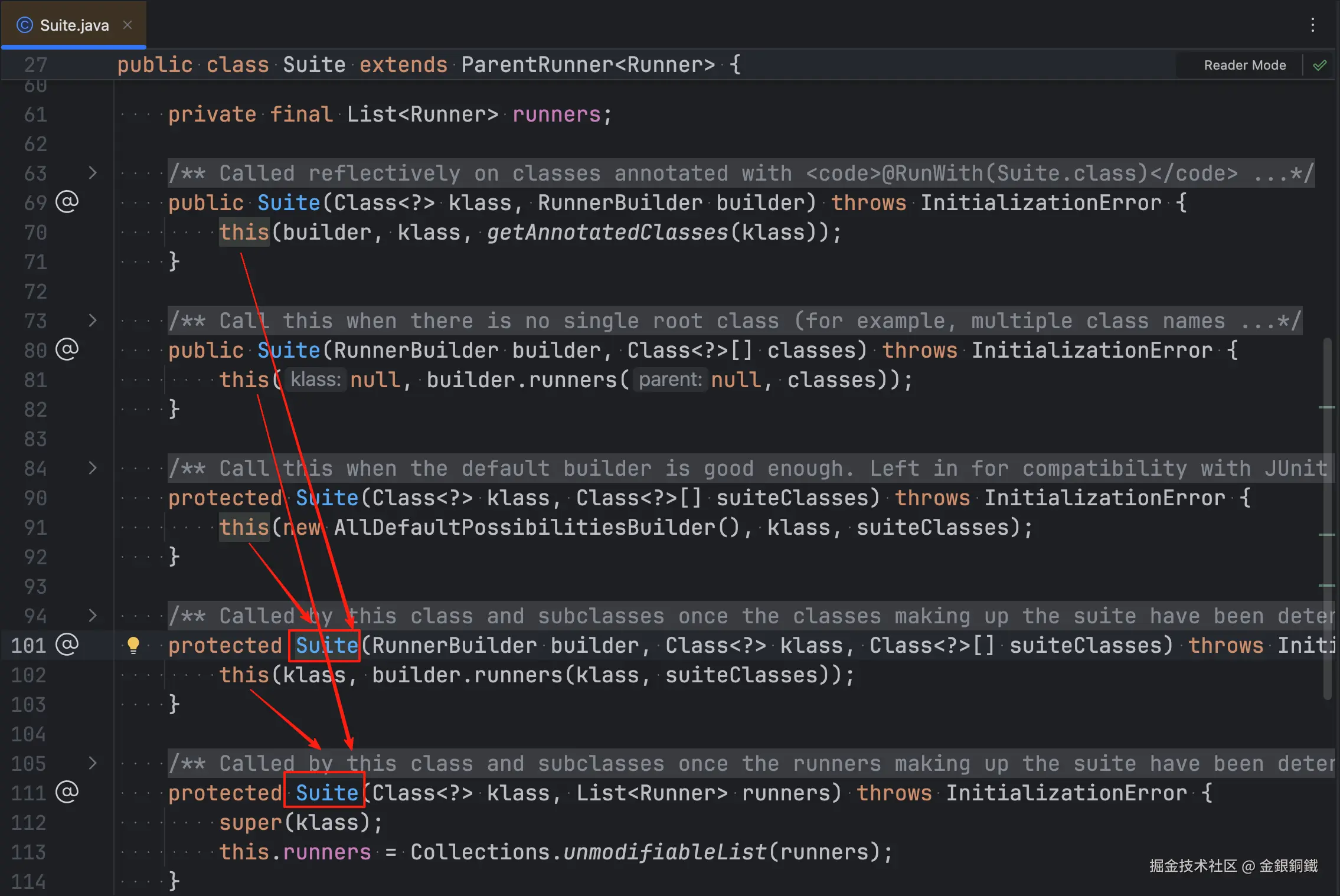 Suite的构造函数时,子节点会保存在org.junit.runners.Suite#runners字段中(每个子节点都是Runner的实例) Suite作为亲节点,会负责查找和运行子节点