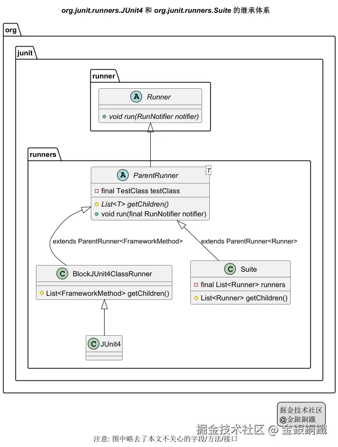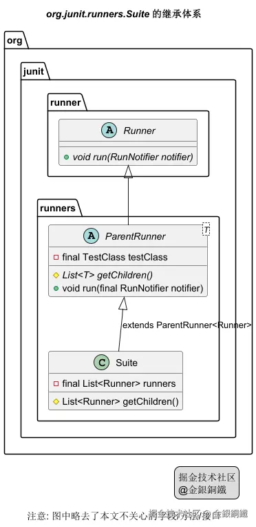 ParentRunner 继承了 Runner,而 Suite 继承了 ParentRunner<Runner>,简要的类图如下 ⬇️