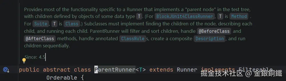 | <math xmlns="http://www.w3.org/1998/Math/MathML"> ParentRunner \text{ParentRunner} </math>ParentRunner | 如果我们将一个 Runner 视为亲子结构,则可以让这个 Runner 继承 ParentRunner. 典型的子类有 BlockJUnit4ClassRunner Suite |