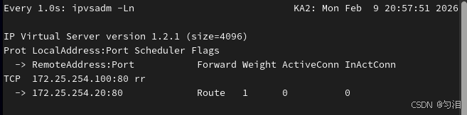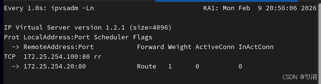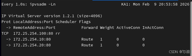 核心内容 :在双主模式基础上,扩展 IPVS 配置,让不同 VIP 代理不同业务:172.25.254.100:80 代理 Web 服务,172.25.254.200:3306 代理 MariaDB 数据库服务;同时在真实服务器上部署数据库并授权,实现 Web + 数据库多业务的高可用负载均衡。