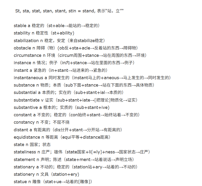 - 词根st(a)-意为"站、站立、立、直立"