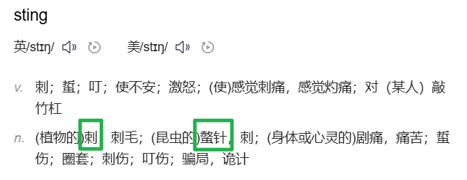 比如单词 sting,意为"刺",你就可以把"刺"这种东西,理解成是一根带尖或带刺的条棍的微缩版本。
