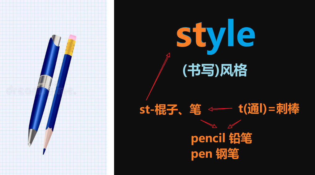 所以,style ,当你想到棍子、笔的时候,你其实也是可以想到【刺棒】的形象的,比如铅笔、钢笔,不就是刺棒的样子吗?