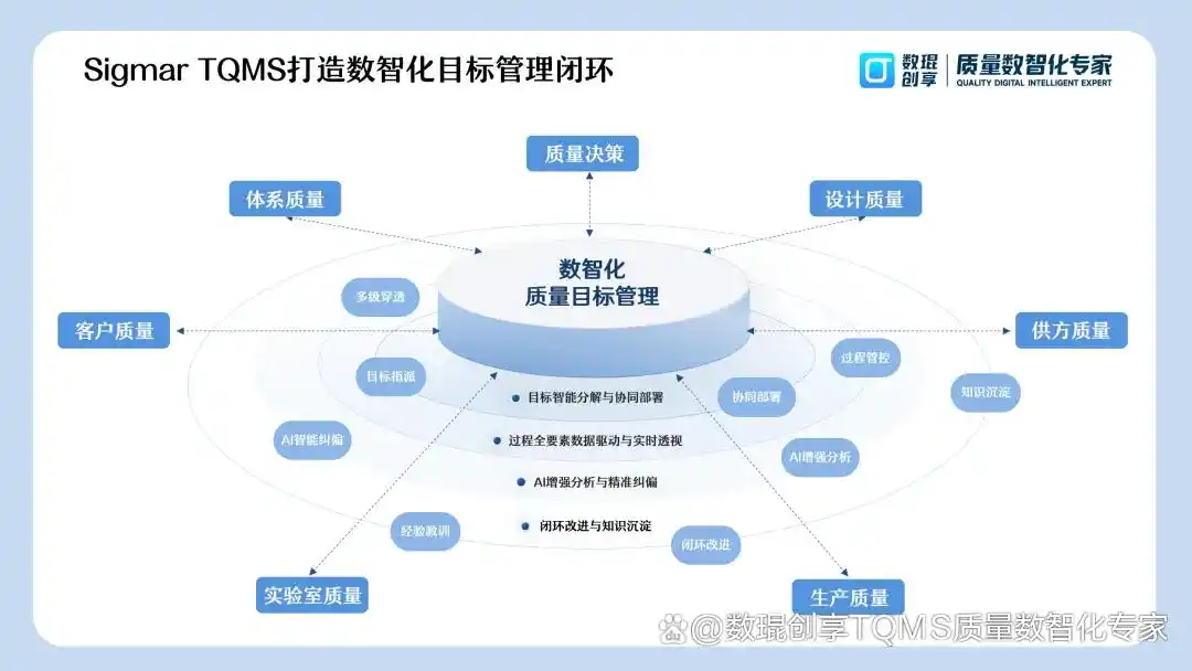 针对以上困境,数琨创享Sigmar TQMS数智化全面质量管理平台以"质量数智化环"为设计模型,以数智化闭环重塑质量目标管理范式,将战略蓝图转化为可量化、可追溯、可驱动的日常运营。