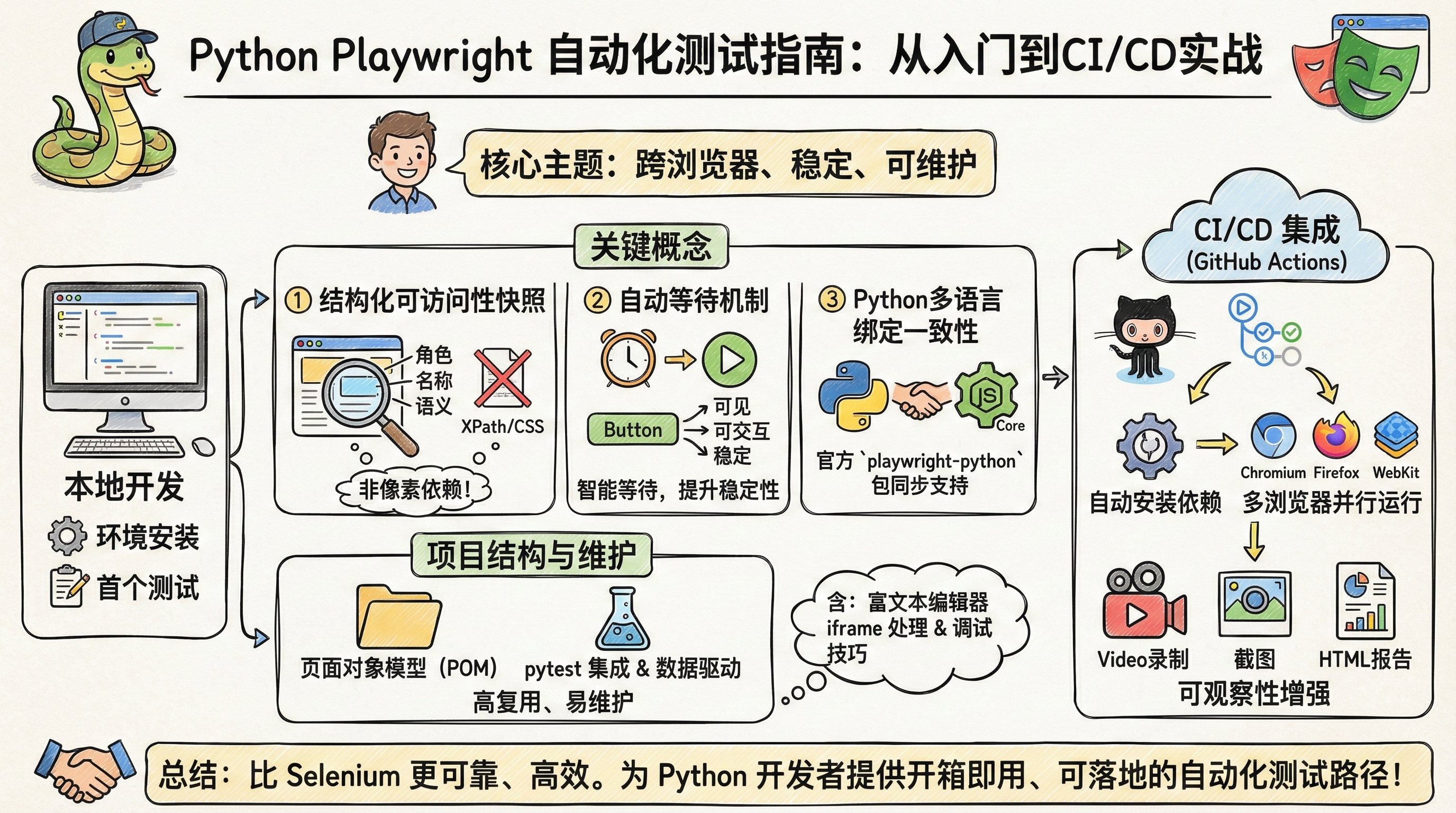 提供一条开箱即用的 Playwright Python 入门路径,覆盖环境陷阱、项目结构与 CI 集成,纠正社区误解并强化实战落地能力。