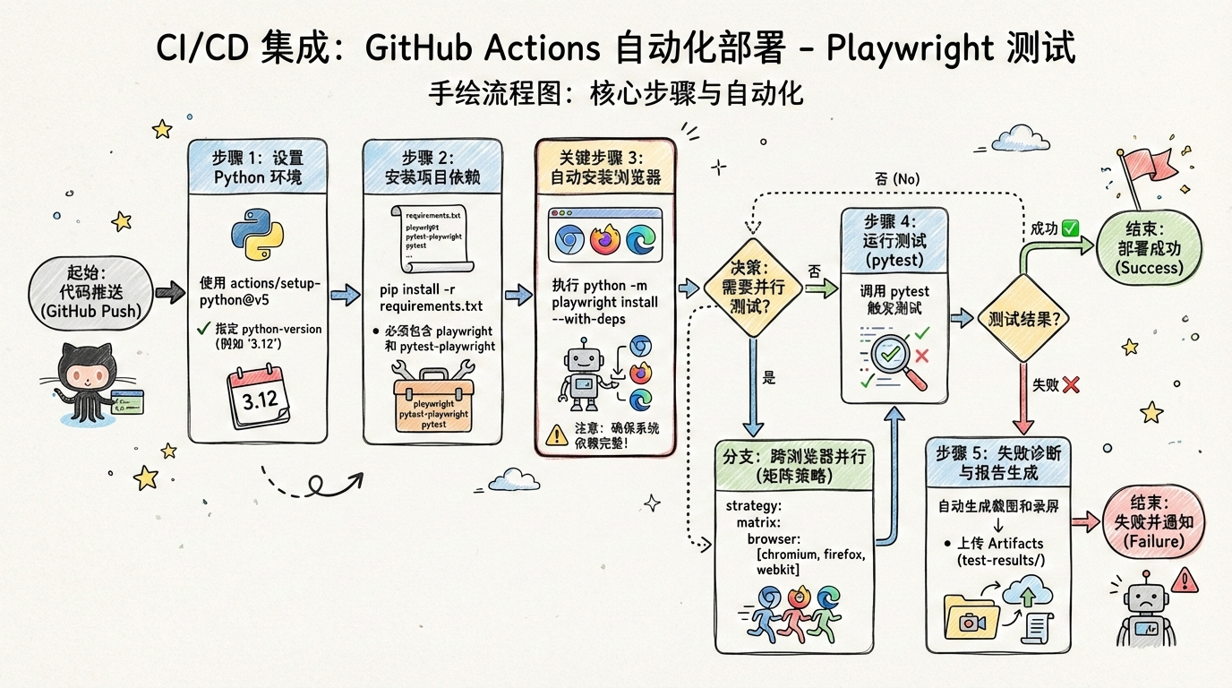 随后在测试命令中借助环境变量(如 ${``{ matrix.browser }})传递给 pytest,或由 pytest-playwright 自动识别。