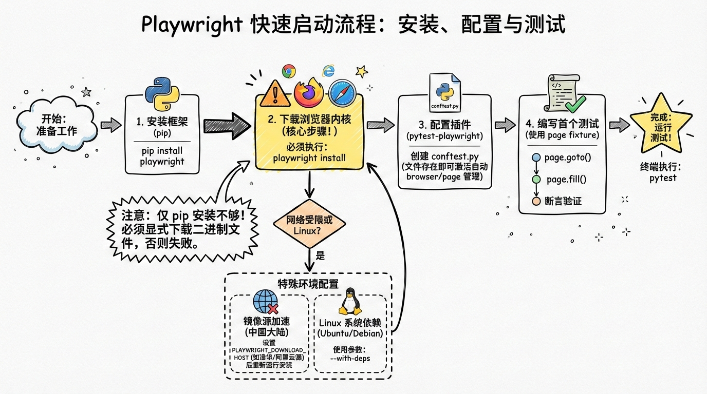 pip install playwright不足以执行测试------浏览器二进制文件需显式安装。