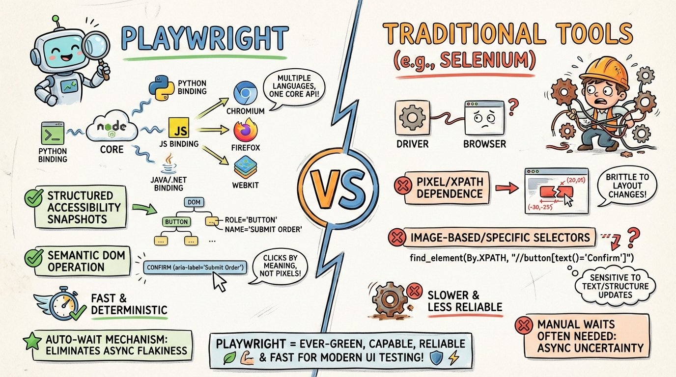 传统自动化工具常依赖截图或像素坐标进行交互,易受界面微小变化干扰。Playwright 则采用结构化可访问性快照技术,而不是基于像素的输入方式。该机制直接操作 DOM 的语义结构,跳过图像处理环节,使交互更快速、轻量且确定。例如,点击按钮时,Playwright 依据元素的可访问性属性(如 role、name)定位,而非屏幕坐标,从而避免因布局偏移导致的失败。
