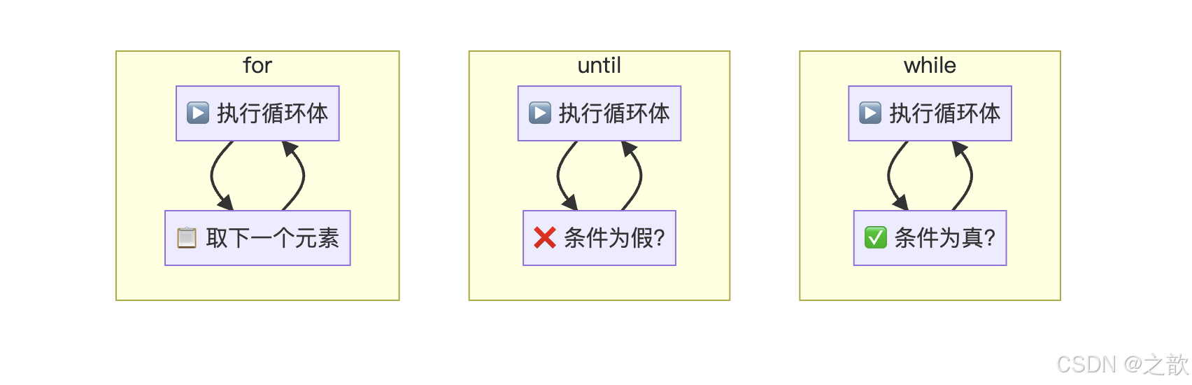 | while / until / for | while 条件为真执行;until 条件为假执行;for 遍历列表或范围 |