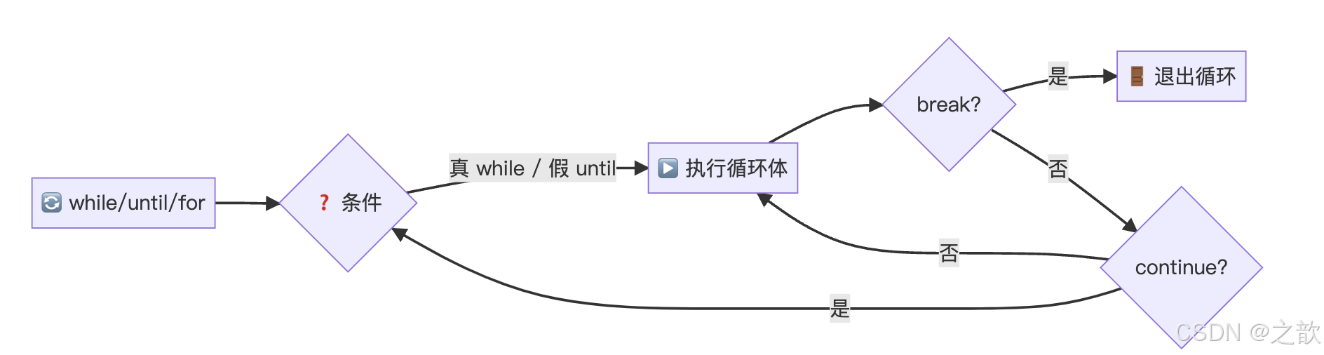 生活例子:while 像"只要还有作业就继续写";until 像"直到闹钟响才停";break 像"写到一半不写了直接交卷";continue 像"这道题跳过,做下一道"。