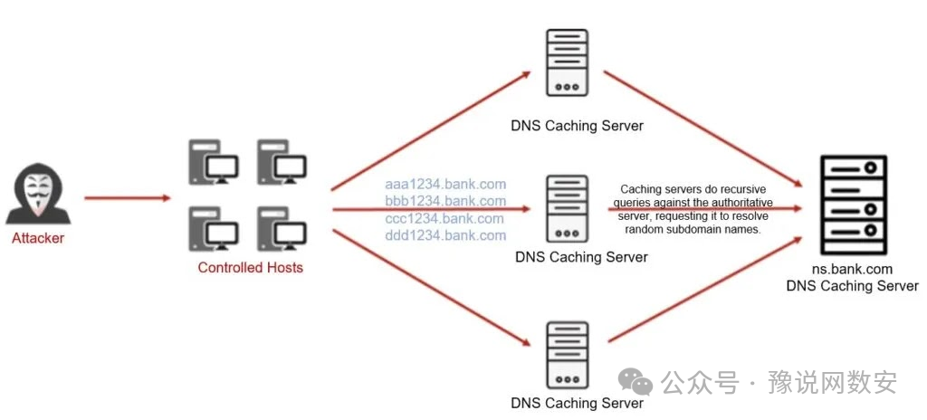 - **随机子域名攻击:**这种攻击方式是向合法域名的不存在的子域名发送大量 DNS 查询,从而使 DNS 服务器不堪重负。